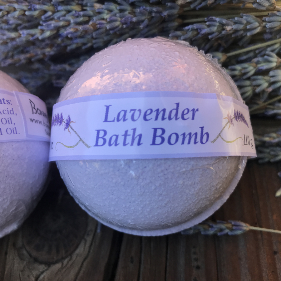Made with only natural and organic ingredients: Sodium bicarbonate, citric acid, sea salt, organic sunflower oil, and pure essential oils. Small bath bombs (2 oz, 57 g) , large bath bombs (4 oz, 110 g) available. Scented only with botanical Lavender Oil !