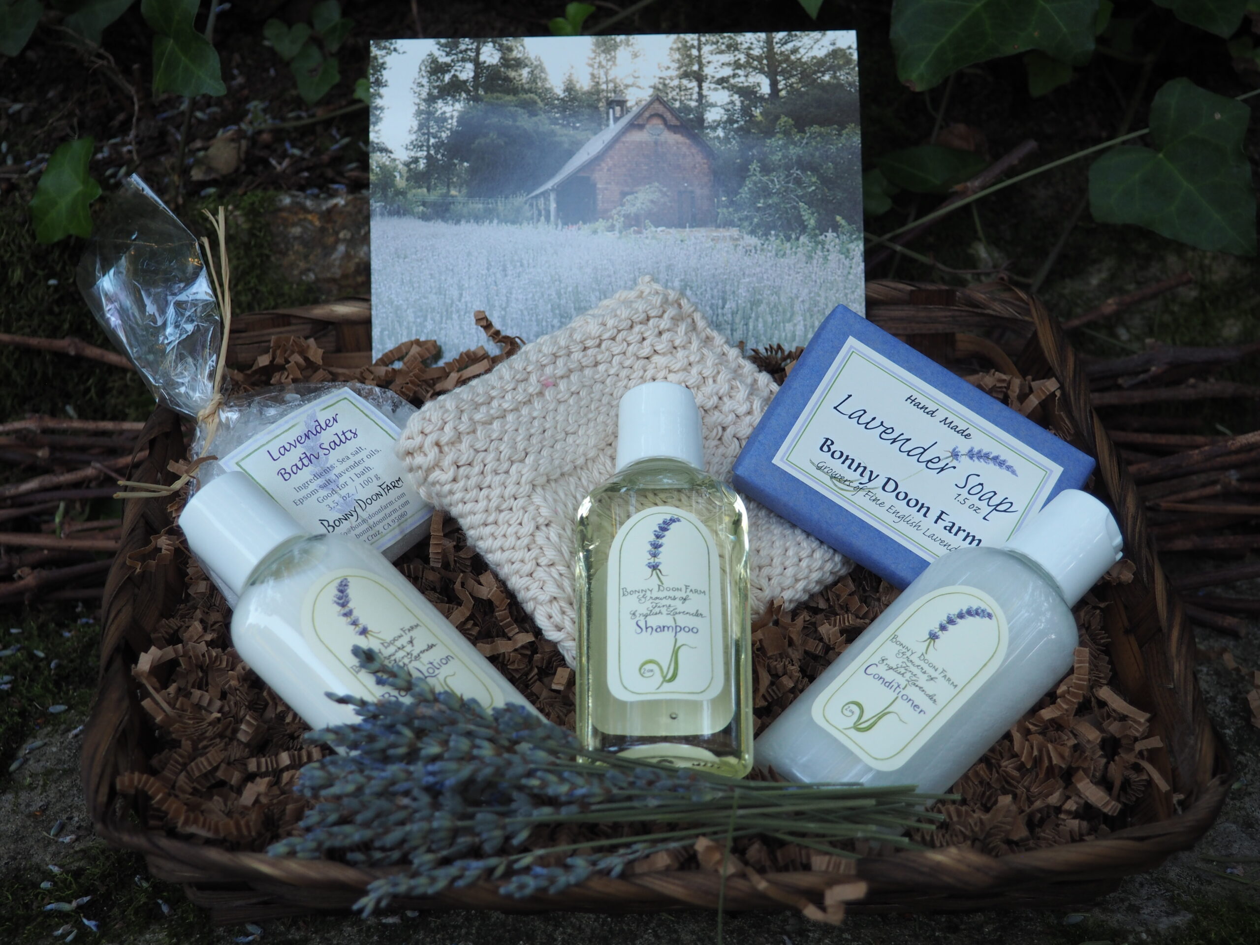 Our Larger Spa Gift Tray… is a special gift for a loved one – includes 8-oz Lavender Lotion, 2-oz Shampoo, Conditioner and Bodywash, our small Lavender Soap, 1/2 oz. Lavender Oil, Bath Salt 10 oz bag (for 3 baths or 12 foot baths) and Card. We nestle these into a bed of a sizzle-stuffed eco-friendly packaging wrapped in cellophane and tied with our BDF ribbon.